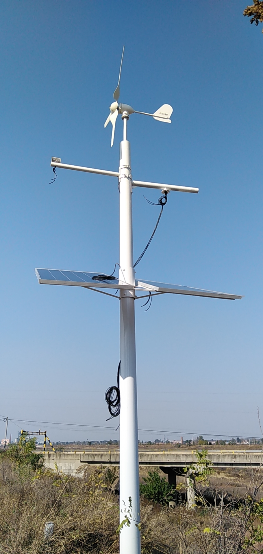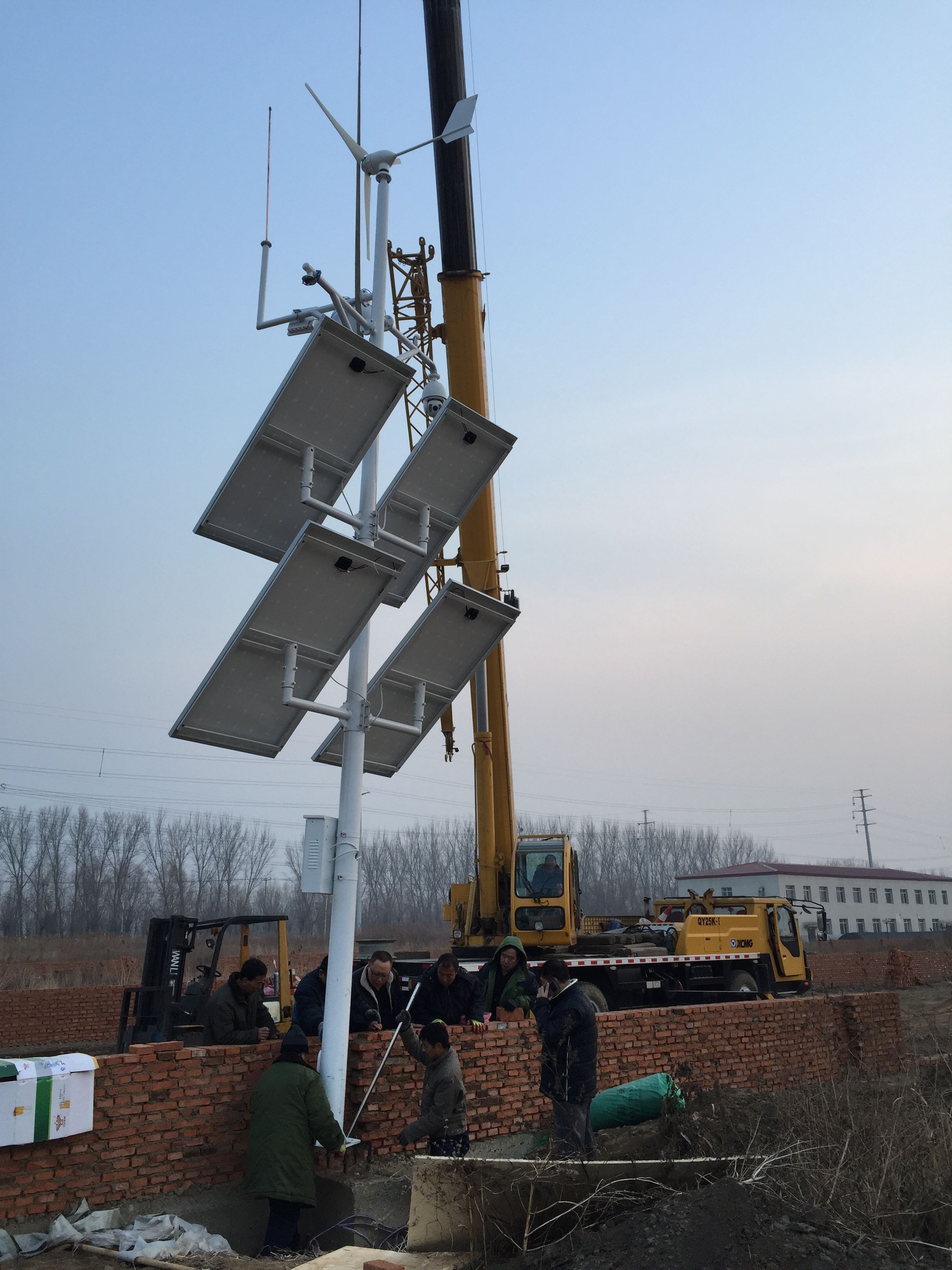风光互补监控供电系统: 系统工作时无需水、油、汽、燃料,只要有光就能发电的特点,是清洁、无污染的可再生能源,而且安装维护简单,使用寿命长,可以实现无人值守,倍受人们的青睐,是新能源的领头羊。 系统由风力发电机和太阳电池组件构成的太阳能组件、风光互补控制装置、监控杆、蓄电池组及附件构成。系统兼具风能和太阳能产品的双重优点,互补性强。由风力和太阳能协同发电,电能储存于蓄电池中,自动感应外界光线变化,无需人工操作。 产品特点: 1)根据地区的风能系数和太阳能资源具体情况和负载耗电量确定太阳能发电的容量。 2)保证所有监控设备持续稳定供电。 3)监控设备考虑全天供电,每日供电时间为:24小时。 4)经济、实用、可靠、安全。 5)连续使用阴雨天长,可达5-7天。 6)可同时提供DC12V 24V或AC220电源。 7)采用的铅晶蓄电池作为储能设备,工作温度在-40℃~+60℃之间,具有高寿命高性能等特点。 8)采用专防雷技术,保证系统稳定运行,不受雷雨干扰。 9)使用监控型控制器或逆变器,对监控信号的正常接收和传输不产生干扰。