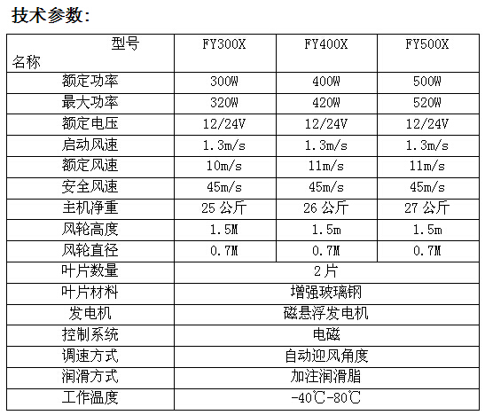 产品特点: 1、起动风速低,风能利用率高;体积小,外型美观、运行振动低。 2、安装采用人性化设计,方便设备安装、维护和检修。 3、风轮叶片采用铝合金,配以优化的气动外形设计和结构设计,风能利用系数高,增加了年发电量。 4、发电机采用技术的永磁转子交流发电机,配以特殊的定子设计,有效地降低发电机的阻转矩,同时使风轮与发电机具有更为良好的匹配特性,机组运行的可靠性。
