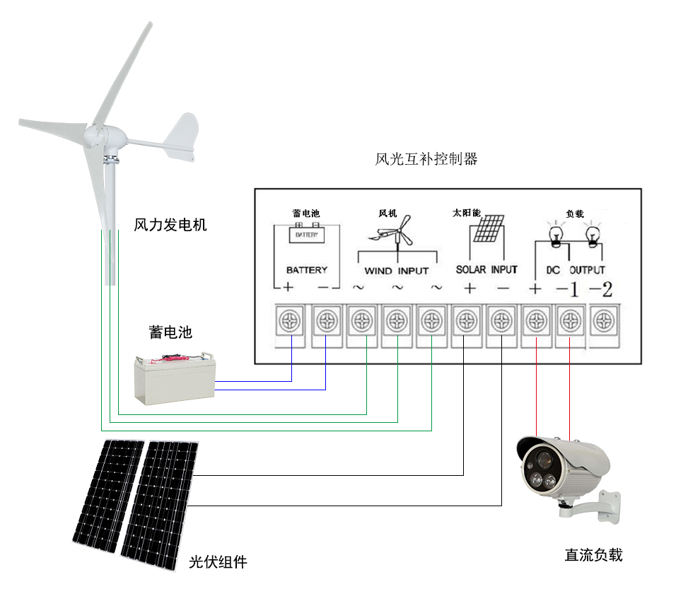 系统特点: 1.根据使用地区的太阳能资源和风力资源具体情况和负载耗电量确定风光互补发电的容量。 2.保证所有监控设备持续稳定供电。 3.监控设备考虑全天供电,每日供电时间为:24小时。 4.风光互补控制逆变器,具有过充过放、过载短路、转速刹车、大风刹车、防雷等保护功能。 5.RS232/485通讯接口,数据实时传送, 历史数据记录和下载。 6.监控型控制器显示参数,如:蓄电池、风机、太阳能的运行参数 7.风光互补系统独立供电、可靠安全。 8.连续使用阴雨天长,可达4-7天。 9.交直流供电方式,满足多种负载用电的需要;可同时提供DC12V 24V或AC220电源。 10.采用太阳能储能蓄电池作为储能设备,工作温度在-40℃~+60℃,使用寿命长的特点。 11.采用避雷防雷技术,保证系统稳定运行。